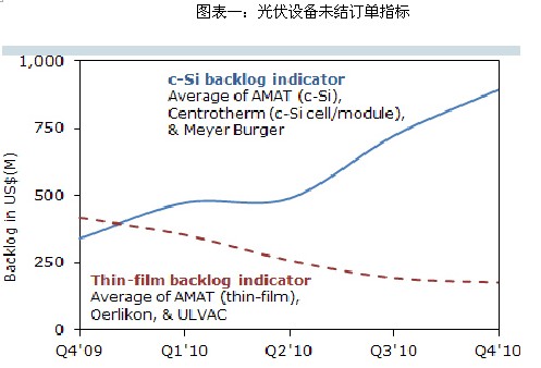 隨著2011年所公布的超越60%年度增長(zhǎng)率的產(chǎn)能的擴(kuò)張,首選設(shè)備供應(yīng)商的訂單使得未結(jié)訂單總量創(chuàng)下新記錄,超過了2008年由高價(jià)格交鑰匙薄膜生產(chǎn)線業(yè)務(wù)推動(dòng)的水平。2010年第四季度末,有20家設(shè)備供應(yīng)商的訂單積累已經(jīng)超過了1億美金,這些訂單主要的出貨時(shí)間集中在2011年上半年。目前的未結(jié)訂單總量與2009年第四季度相比有26%的增長(zhǎng),導(dǎo)致2010年的訂單出貨比原高于上一年水平(1.24),其中2010年第二季度的更是創(chuàng)下了1.7的八季高點(diǎn)。