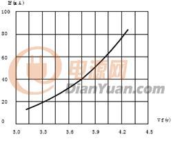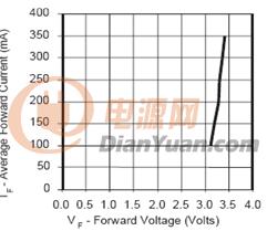 假如用干電池或蓄電池供電,那么因為LED伏安特性的非線性,很小的電壓變化就會引起很大的電流變化,上圖中電源電壓在3.3V時正向電流為20mA的LED,如果用3節(jié)干電池供電,新的電池電壓超過1.5V,3節(jié)就是4.5V,LED的電流就會超過100mA,很快就會燒壞。對于1W的大功率LED也是如此,圖2是某公司1W的LED伏安特性,而一個12V蓄電池的電壓,在充滿電到快放完電的電壓可以從14.5V降到10.5V。相差將近20%。從伏安特性上可以看出,電源電壓的10%的變化(3.4V-3.1V),就會引起正向電流的3.5倍的變化(從350mA變到100mA)。