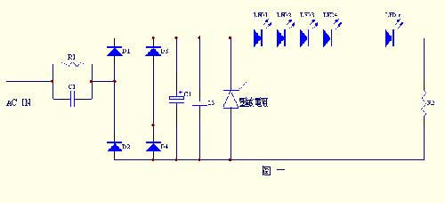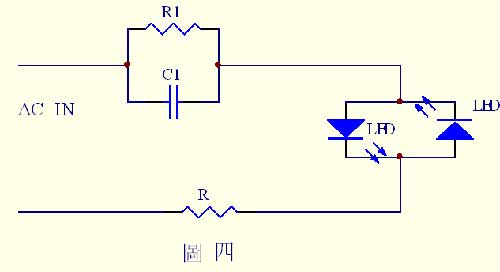 圖四是一個(gè)最簡(jiǎn)單的電容降壓應(yīng)用電路﹐電路中利用兩只反并聯(lián)的LED對(duì)降壓后的交流電壓進(jìn)行整流﹐可以廣泛應(yīng)用于夜光燈﹑按鈕指示燈﹐要求不高的位置指示燈等場(chǎng)合。