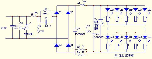 在圖三電路中﹐C1﹑R1﹑壓敏電阻﹑L1﹑R2組成電源初級(jí)濾波電路﹐能將輸入瞬間高壓濾除﹐C2﹑R2組成降壓電路﹐C3﹑C4﹑L2﹑及壓敏電阻組成整流后的濾波電路。此電路采用雙重濾波電路﹐能有效地保護(hù)LED不被瞬間高壓擊穿損壞。