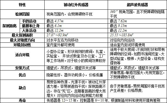 表1:被動紅外傳感器和超聲波傳感器性能比較