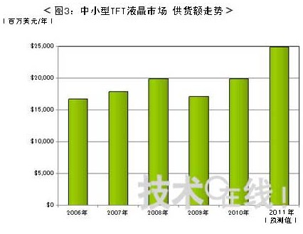 圖3表示中小型液晶市場過去5年內(nèi)的業(yè)績與今年的供貨額預(yù)測。手機及數(shù)碼相機等使用的中小型FPD因價格不斷降低,市場范圍逐步擴大,導(dǎo)致中小型液晶 市場的供貨額與供貨量增長幅度相比,持續(xù)出現(xiàn)了低增長,因2008年雷曼危機后消費低迷,這一市場陷入了供貨額大幅減少的局面。在此期間,許多中小型液晶 廠商都有過力圖通過縮小業(yè)務(wù)而生存下去的辛酸經(jīng)歷,包括同行業(yè)廠商間的業(yè)務(wù)撤銷與合并以及淘汰設(shè)備等。