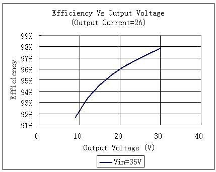 圖中的輸入電壓為35V,輸出電流為2A,當輸出電壓為30V時,效率可以高達97.8%。但是當輸出電壓降低到20V時,效率就降為96%;當輸出電壓降低為10V時,效率就降低為92%。在這三種情況下,盡管其輸出功率依次為60W,40W和20W,但是其損耗功率卻依次為1.2W,1.6W,1.6W。后兩種情況下功耗增大了33%。假如恒流模塊的散熱系統(tǒng)設計得非常臨界,增加33%的耗散功率就有可能會使芯片的結(jié)溫升高,以致發(fā)生過溫保護而無法工作,嚴重時也有可能使芯片燒毀。