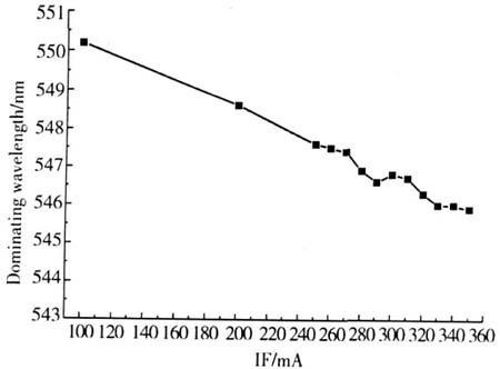 當正向電流為350mA時,主波長為545.8nm;當正向電流減小為200mA時,主波長為548.6nm;當正向電流減小為100mA時,主波長為550.2nm。