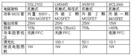 目前市場上主要有恩智浦的SSL2101/2,國半的LM3445,iWatt的iW3610和OnSemi的NCL3000四種兼容可控硅調(diào)光的驅(qū)動IC。其特點如下: