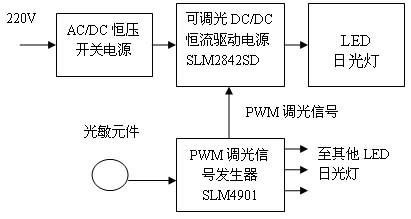 為了減小在強日光下不必要的照明,可以采用光敏自動調(diào)光LED日光燈(或任何其他LED燈具)。它的方框圖如圖11所示。