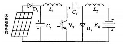 充電控制器作為光伏電池和鉛酸蓄電池的接口電路,一般都希望讓其工作在最大功率點(diǎn),實(shí)現(xiàn)更高的效率,但是在實(shí)現(xiàn)最大功率點(diǎn)跟蹤(MPPT)的同時(shí),還需要考慮進(jìn)行蓄電池充電控制。目前常用的主電路拓?fù)渲饕薪祲盒碗娐罚˙uck)變換器、升壓型電路(Boost)變換器、丘克電路(Cuk)變換器等。一般光伏電池輸出電壓波動(dòng)較大,而B(niǎo)uck變換器或Boost變換器只能進(jìn)行降壓或升壓變換,受此影響,光伏電池不能在大范圍內(nèi)完全工作于最大功率點(diǎn),從而造成系統(tǒng)效率下降。同時(shí),Buck變換器輸入電流紋波較大,如果輸入端不加一個(gè)儲(chǔ)能電容就會(huì)使系統(tǒng)工作在斷續(xù)狀態(tài)下,從而導(dǎo)致光伏電池輸出電流時(shí)斷時(shí)續(xù),不能處于最佳工作狀態(tài);而B(niǎo)oost變換器輸出電流紋波較大,用此電流對(duì)蓄電池進(jìn)行充電,不利于蓄電池的使用壽命;Cuk變換器同時(shí)具有升壓和降壓功能,將Cuk變換器應(yīng)用于光伏系統(tǒng)充電控制器中,可以在較大范圍內(nèi)實(shí)現(xiàn)最大功率點(diǎn)跟蹤,有利于系統(tǒng)效率的提高。因此,常選用Cuk變換器作為充電控制器的主電路,其系統(tǒng)拓?fù)淙鐖D7所示。