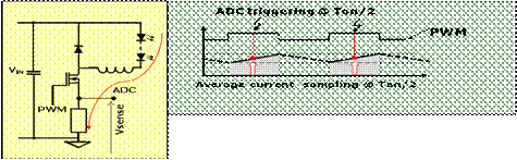 如果能夠保證連續(xù)導(dǎo)通模式運行,這個觸發(fā)操作與隨后的模數(shù)轉(zhuǎn)換過程將會計算出均流值,而不是在電流增大期間通過軟件處理過程來估算均流,如圖2b所示。