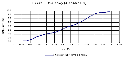 為了全面地分析采用反向降壓轉(zhuǎn)換器拓?fù)鋵崿F(xiàn)的數(shù)字電流控制器,圖4對能效與電流負(fù)載進(jìn)行了對比分析。在全負(fù)載時,四條通道可實現(xiàn) 97%的總能效,這可滿足主要的節(jié)能要求。