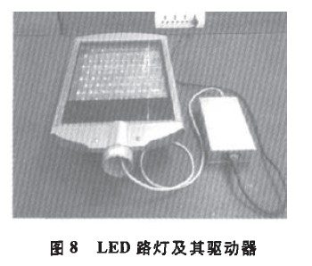 自動斷開,整個控制電路工作,從而減少恒壓電源的輸出,當溫度降低到48℃時,溫度繼電器自動閉合,并使電源正常輸出。經(jīng)過測試,得出驅(qū)動器Vo端與Trim端之間連接的總電阻值尺與驅(qū)動器輸出電壓Uo之間的關(guān)系,見表2??梢钥闯觯弘S著電阻的增加,輸出電壓呈減小趨勢。當溫度達到60℃時,圖7控制電路中溫度繼電器Kt斷開,此時,只要電阻匹配得當,我們便可以得到設(shè)定的輸出電壓。各阻值計算方法同上,在此不作具體計算。3試制驅(qū)動器實測結(jié)果本項研究進行了大功率LED路燈和LED投射燈及驅(qū)動器的研制工作。圖8為LED路燈樣燈及其恒流驅(qū)動器,燈體采用一體化設(shè)計,測得常溫輸入驅(qū)動器的交流電流為270mA,燈長時間運行狀況良好,其總光通量為3 408 lm,在控溫作用時,輸出電流減小為常溫的87%。圖9為LED投射燈樣燈及其恒壓驅(qū)動器,測得常溫下輸入驅(qū)動器的交流電流為140mA,總光通量為1 011 lm,在控溫作用時,電壓減小為常溫的90%。