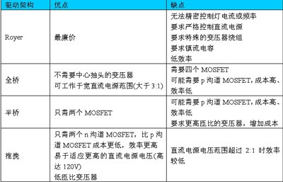 可以用多種架構(gòu)產(chǎn)生驅(qū)動(dòng)CCFL所需的交流波形,包括Royer(自振蕩,self-oscillating)、半橋、全橋和推挽。表1詳細(xì)歸納了這四種架構(gòu)各自的優(yōu)缺點(diǎn)。