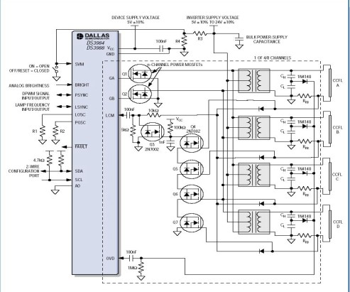 DS3984(四通道)和DS3988(八通道)CCFL控制器解決了本文所提到的所有這些設(shè)計(jì)挑戰(zhàn)??蓪⑦@些元件配置為每個(gè)通道驅(qū)動(dòng)一個(gè)燈(圖6),或者每通道多個(gè)燈(圖7),用戶(hù)可靈活裁減設(shè)計(jì),以滿(mǎn)足自己的性?xún)r(jià)比目標(biāo)。多個(gè)DS3984/DS3988可輕松串聯(lián),以支援任意數(shù)量的燈來(lái)為L(zhǎng)CD電視螢?zāi)惶峁┍彻狻?br />