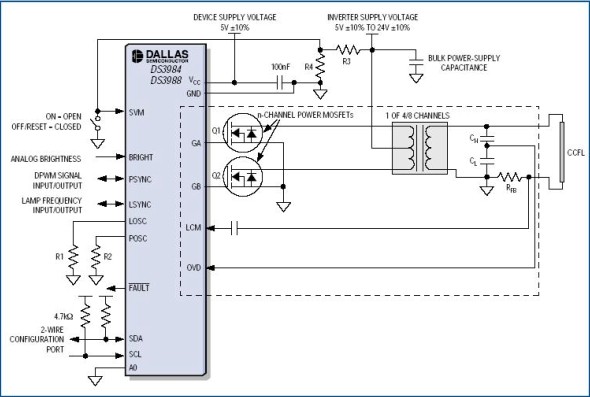 DS3984/DS3988采用推挽驅(qū)動(dòng)架構(gòu),可以使用更低成本、更高效率的n通道MOSFET。轉(zhuǎn)換器直流電源電壓也可采用更高的電壓。單獨(dú)的燈控制和監(jiān)測(cè)可提供均勻的亮度,并減少轉(zhuǎn)換器的元件總數(shù)。采用單獨(dú)的燈控制時(shí),如果某一個(gè)燈失效,僅會(huì)使這個(gè)失效的燈停止工作,其他燈繼續(xù)工作,并不會(huì)受影響。片上振蕩器產(chǎn)生的燈頻和脈沖調(diào)光頻率被嚴(yán)格限定在±5%水準(zhǔn),消除了對(duì)於顯示影像的影響,并且也可被同步至外部時(shí)脈源。