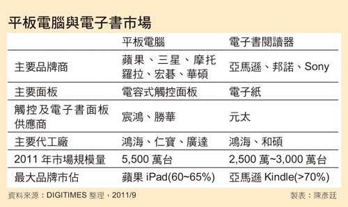蘋(píng)果iPad系列持續(xù)在平板計(jì)算機(jī)市場(chǎng)一枝獨(dú)秀,爆發(fā)性成長(zhǎng)讓各家電信、PC及手機(jī)制造廠趨之若鶩,由于平板計(jì)算機(jī)具備多媒體觸控特性,讓電子書(shū)閱讀器業(yè)者憂心忡忡,擔(dān)心平板計(jì)算機(jī)大軍崛起恐沖擊電子書(shū)市場(chǎng),然蘋(píng)果憑借軟件、成本、價(jià)格與規(guī)模優(yōu)勢(shì),陸續(xù)讓部分平板計(jì)算機(jī)業(yè)者知難而退,反觀電子書(shū)市場(chǎng)穩(wěn)定成長(zhǎng),供應(yīng)鏈廠商業(yè)績(jī)持續(xù)翻揚(yáng),平板計(jì)算機(jī)大軍暫難發(fā)揮影響力,讓電子書(shū)廠商暫時(shí)松了一口氣。就目前平板計(jì)算機(jī)品牌版圖來(lái)看,仍以蘋(píng)果iPad系列獨(dú)占鰲頭,業(yè)界預(yù)估2011年市占率約60~65%,其次是三星電子(Samsung Electronics),市占率約5~6%,其它各品牌廠市占分別落在1~3%,尤其是2011年初時(shí)被業(yè)界視為蘋(píng)果iPad殺手,未推出產(chǎn)品就先轟動(dòng)的惠普(HP)、RIM及摩托羅拉(Motorola)等品牌廠,推出前預(yù)估出貨量很高,然這些憑借品牌及軟件平臺(tái)光芒的先頭部隊(duì)卻最先敗陣,讓現(xiàn)存平板計(jì)算機(jī)業(yè)者更加憂心。