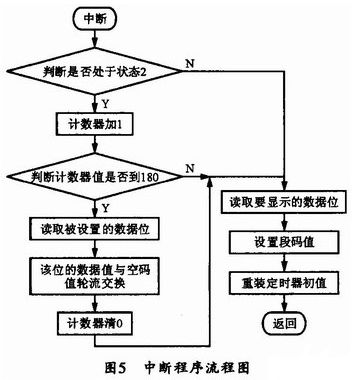 在狀態(tài)2下,參數(shù)設(shè)定時(shí),設(shè)定位要實(shí)現(xiàn)閃爍,以確定正在被設(shè)置的數(shù)據(jù)位。實(shí)現(xiàn)閃爍的基本思想是每隔500 ms,當(dāng)前閃爍數(shù)據(jù)位的段碼值就由數(shù)據(jù)狀態(tài)變?yōu)榭沾a狀態(tài),下一個(gè)500 ms再由空碼狀態(tài)變?yōu)閿?shù)據(jù)狀態(tài),并不斷循環(huán)執(zhí)行此操作(共陽極顯示方式下空碼值為0XFF)。這樣,從用戶角度看,當(dāng)前被設(shè)定的數(shù)據(jù)位就是閃爍的。這里可通過設(shè)定一個(gè)計(jì)數(shù)器來確定轉(zhuǎn)換時(shí)間,當(dāng)計(jì)數(shù)值達(dá)到500/2.78(約為180)時(shí),當(dāng)前閃爍數(shù)據(jù)位就進(jìn)行段碼值轉(zhuǎn)換。本系統(tǒng)的中斷程序流程圖如圖5所示。