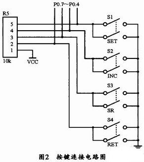 獨(dú)立式鍵盤通常用在按鍵較少的系統(tǒng)中,每個(gè)按鍵單獨(dú)占有一根I/O口線,各鍵的工作狀態(tài)相互獨(dú)立,互不影響。由于本文的顯示面板的調(diào)節(jié)按鍵只有4個(gè),因此,設(shè)計(jì)使用獨(dú)立式按鍵接法。其鍵盤接口電路如圖2所示。