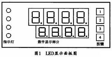 本文的LED通用智能型顯示面板如圖1所示。該面板中央為兩排LED數(shù)碼管,每排4位。上排為紅色,下排為綠色。面板左邊為四個(gè)發(fā)光二極管,右邊為四個(gè)按鍵開關(guān)。其顯示和開關(guān)可根據(jù)不同應(yīng)用定義。