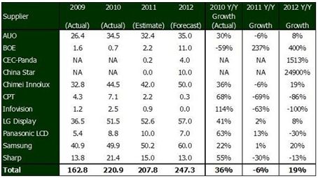 中國大陸的新進面板廠商京東方、華星光電與中電熊貓等也都在2012年隨著其大世代線的量產(chǎn)設(shè)下了相當(dāng)積極的出貨目標(biāo);而一些生產(chǎn)較小尺寸液晶電視面板的廠商如華映與龍騰等則會在2012年逐步退出電視面板市場。