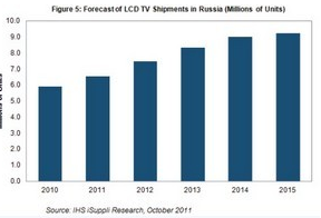 據(jù)IHS iSuppli公司的電視研究報(bào)告,隨著青睞先進(jìn)電視技術(shù)的中產(chǎn)階級不斷壯大,今年俄羅斯液晶電視出貨量預(yù)計(jì)強(qiáng)勁增長10%。俄羅斯屬于所謂的金磚國家(BRIC),是一個重要市場。