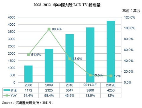 隨著2011年接近漸近尾聲,中國(guó)大陸LCD TV年銷售量預(yù)估將成長(zhǎng)13.5%,但與2009年的98.4%和2010年的43.9%成長(zhǎng)率相比,已不可同日而語(yǔ)。