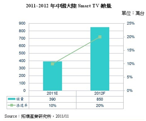 - 2012年中國(guó)大陸Smart TV銷售量將達(dá)850萬(wàn)臺(tái)