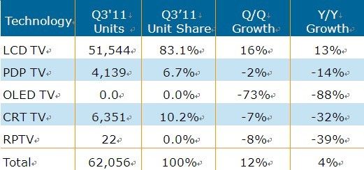 全球液晶電視出貨增幅比預(yù)期高出1%,年成長(zhǎng)率達(dá)12.9%,出貨量為5千150萬(wàn)臺(tái)。相較于第一季和第二季均僅為個(gè)位數(shù)成長(zhǎng),這表明終端市場(chǎng)需求正在提高。部分尺寸的液晶電視價(jià)格要低于一般價(jià)格水平,如32寸為300美金,40-42寸為500美金。液晶電視背光持續(xù)向LED轉(zhuǎn)移,但轉(zhuǎn)移速率比預(yù)期要低。LED背光模式占全部液晶電視出貨量的48%,其中大部分為側(cè)光式。120Hz及以上掃描頻率的電視出貨比率沒有大的改變,第三季度占液晶電視出貨量的22%。第三季3D電視的占比從第二季的9%上升到11%。具備高端性能3D與LED背光電視出貨成長(zhǎng)較預(yù)期緩慢,表明消費(fèi)者花錢仍然保守,也不愿意花更多的錢購(gòu)買高性能電視。