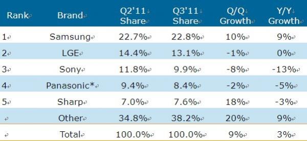 2011年第三季三星全球平板電視營(yíng)收占比微幅提高,為22.8%,遠(yuǎn)遠(yuǎn)領(lǐng)先第二大品牌商樂(lè)金電子。就營(yíng)收而言,除了在日本沒有出售電視,三星在全球其他各個(gè)地區(qū)營(yíng)收第一,在亞太地區(qū)和拉美地區(qū)領(lǐng)先于樂(lè)金電子。三星液晶電視和等離子電視營(yíng)收居于首位,CRT電視居第二位,并是五大品牌商中唯一一家營(yíng)收同比成長(zhǎng)的品牌商。