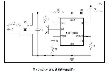 而MAX16840芯片有3個(gè)重要引腳功能:FB引腳電壓可檢測(cè)輸入電流,并調(diào)節(jié)其平均值;而輸入引腳(REFI)用于設(shè)置輸入電流值,引腳電壓低于特定門限時(shí),輸入電流與該電壓成正比,電壓超過(guò)特定門限時(shí),輸入電流將置于固定的預(yù)置水平。據(jù)此利用REFI的非線性特性,連接一個(gè)NTC電阻,即可得到熱折返保護(hù);IN引腳具有內(nèi)部過(guò)壓保護(hù),避免內(nèi)部開(kāi)關(guān)MOSFET在LED串開(kāi)路或LED串電壓過(guò)高時(shí)損壞;它帶有一個(gè)獨(dú)立的EXT引腳,確保低輸入電壓開(kāi)啟時(shí)提供一個(gè)觸發(fā)啟動(dòng)電流,以配合電子變壓器正常工作。EXT驅(qū)動(dòng)外部npn晶體管,一旦IN跌落到5.5V UVLO門限以下,將EXT拉至地電平,外部npn晶體管關(guān)斷。其IC采用3mm x 3mm、10引腳、TDFN封裝,-40°C至+125°C工作溫度范圍。圖4為MAX16840典型應(yīng)用示意圖。它被廣泛應(yīng)用于MR16及其它12V交流或直流輸入LED照明之中。