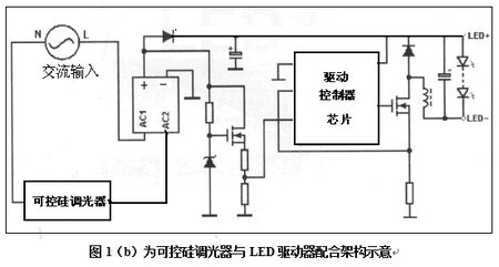 所以它是LED照明常用方法,見(jiàn)圖1(b)所示可控硅調(diào)光器與LED驅(qū)動(dòng)器配合架構(gòu)示意。