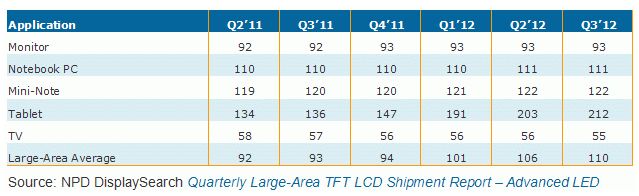 NPD DisplaySearch最新季度大尺寸TFT-LCD面板出貨調(diào)查指出兩個(gè)趨勢,一是平板電腦用面板持續(xù)往更高分辨率方向發(fā)展,二是低成本直下式LED背光面板將逐漸成為TFT-LCD電視面板另一主流。