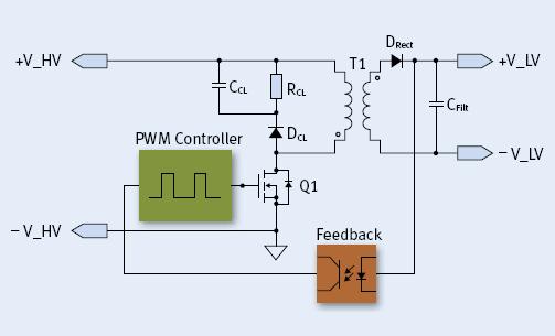 對于最高約100W的隔離電源,反激式拓撲已被廣為接受,因為它相對簡單,構成元件少,具有成本效益優(yōu)勢且性能合理。借助飛兆半導體應用手冊AN-4137,其基本工作原理簡單并易于解釋。當MOSFET Q1導通時,變壓器T1初級端中的電流線性斜升,建立了一個儲存能量的磁場,變壓器繞組的極性點顯示極性滿足條件以致次級端整流器DRect在此期間關斷。一旦MOSFET斷開,根據(jù)楞次定律(Lenz''s law),跨越變壓器的所有電壓的極性反轉(zhuǎn)。DRect現(xiàn)在開始導通且儲存在T1中的能量傳送到電容器CFilt中。PWM控制器的占空比(Duty cycle)和變壓器圈比一起決定輸出電壓,其在隔離反饋網(wǎng)絡的幫助下是穩(wěn)定的。因為初級和次級之間的不完全耦合,即漏電感的存在,網(wǎng)絡DCL、CCL 和RCL鉗位電壓突升。這對于減少Q(mào)1的電壓應力是重要的,但同時也是功率損耗的一個來源,因為RCL中的能量被消耗了。