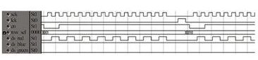 掃描驅(qū)動(dòng)輸出信號(hào)的仿真波形如圖5所示,其中en是灰度控制信號(hào),用來(lái)控制顯示時(shí)間,產(chǎn)生灰度效果;row_sel是行選信號(hào),顯示時(shí)用于確定點(diǎn)亮哪一行;sck是移位時(shí)鐘,lck是鎖存時(shí)鐘,ds_red、ds_blue、ds_green是上屏紅、藍(lán)、綠數(shù)據(jù)的輸入端。仿真時(shí)紅、藍(lán)、綠顯示數(shù)據(jù)分別設(shè)定為01交錯(cuò)、全1、全0??梢钥吹?,在移位時(shí)鐘的作用下數(shù)據(jù)移位正確,移位完成后,lck變?yōu)楦唠娖?,將?shù)據(jù)鎖存輸出到LED屏上顯示。