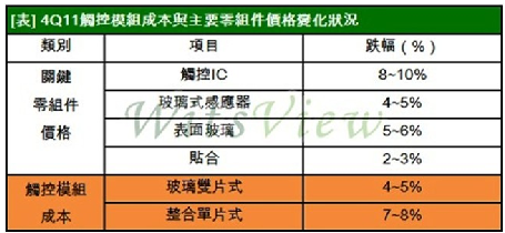 2011年第四季觸控模組成本與主要零組件價(jià)格變化狀況