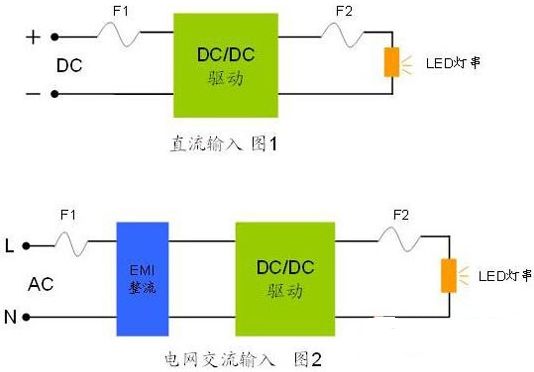 面對LED照明的眾多應(yīng)用領(lǐng)域,由于市場并沒有形成統(tǒng)一的規(guī)范,存在多種多樣的驅(qū)動解決方案,但是萬變不離其中,從過流保護(hù)的角度來看大體上根據(jù)燈體的輸入電流來可以分為:直流輸入和電網(wǎng)交流輸入兩種最基本的類型,兩種類型的主要區(qū)別在于驅(qū)動電源是否有交流轉(zhuǎn)直流的模塊。當(dāng)然市場上也有很多電阻、阻容降壓等低成本解決方案,沒有EMI整流和恒流驅(qū)動的模塊,但是由于初級端保險絲的選用要求與圖2是一致,在此歸入第二種類型。