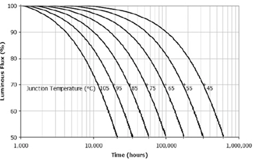 圖1. Cree公司LED的結(jié)溫和光衰壽命試驗結(jié)果