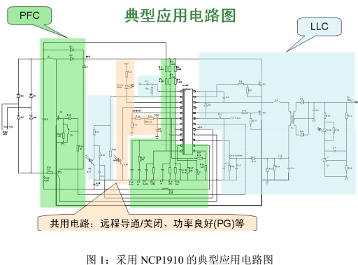 圖1是采用NCP1910的典型應(yīng)用電路圖共用電路,它包括遠(yuǎn)程PFC段、LLC段,以及實現(xiàn)導(dǎo)通/關(guān)閉、功率良好(PG)等的共用電路。