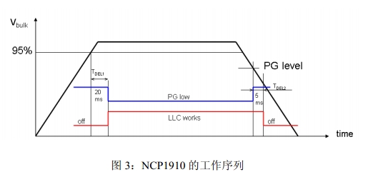 NCP1910的工作序列如圖3所示,如果PFC未就緒,LLC就不能啟動;一旦PFC就緒,就會開始一段20ms的延遲;延遲結(jié)束后PGout引腳假定為低電平,LLC可以開始工作。在撥除交流輸入關(guān)閉電源時Vbulk降低,到達(dá)PG信號時,PGout引腳被釋放(開路);如果Vbulk到達(dá)LLC停止電平,LLC停止工作;或者如果Vbulk緩慢下降,如處在輕載狀態(tài),LLC會在PGout引腳被釋放5ms后停止工作。