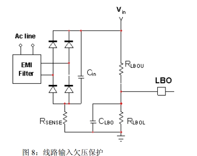 •可調(diào)節(jié)輸入欠壓(BO),F(xiàn)B引腳電壓占Vbulk的一部分,不需要高壓感測軌,可以省電;