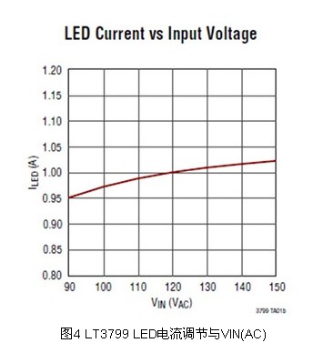 此外,LT3799在整個(gè)輸入電壓、輸出電壓和溫度范圍內(nèi)提供LED電流調(diào)節(jié)。從圖4可見,正如大多數(shù)美國(guó)照明應(yīng)用所要求,當(dāng)輸入從90VAC變到150VAC時(shí),LED電流保持在±5%的調(diào)節(jié)范圍內(nèi)。LT3799采用一個(gè)獨(dú)特的電流檢測(cè)電路取代了光耦合器,以向二次側(cè)提供良好調(diào)節(jié)的電流。此舉不僅降低了成本,還改善了可靠性。