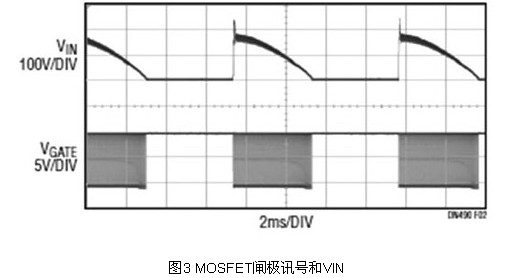 當(dāng)TRIAC調(diào)光器處于斷開狀態(tài)時(shí),其實(shí)不是徹底斷開的。有相當(dāng)大的漏電流通過(guò)其內(nèi)部濾波器流至LED驅(qū)動(dòng)器。這個(gè)電流為L(zhǎng)ED驅(qū)動(dòng)器的輸入電容器充電,進(jìn)而導(dǎo)致LED隨機(jī)開關(guān)和閃爍。過(guò)往的解決方案是增加一個(gè)泄能電路,該電路包括一個(gè)大且昂貴的高壓金屬氧化物半導(dǎo)體場(chǎng)效晶體管(MOSFET)。LT3799將變壓器一次側(cè)繞組和主開關(guān)用作泄能電路,因此無(wú)需這類MOSFET或其他任何額外的組件。如圖3所示,當(dāng)TRIAC斷開時(shí),MOSFET閘極訊號(hào)為高,且MOSFET接通,進(jìn)而泄放掉漏電電流,并保持輸入電壓為 0伏特(V)。TRIAC一導(dǎo)通,MOSFET就無(wú)縫地變回正常的供電組件。