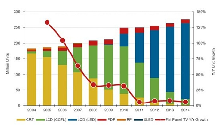 2004-2014全球電視按技術(shù)別出貨量及預(yù)測(cè)(單位:百萬(wàn)臺(tái))