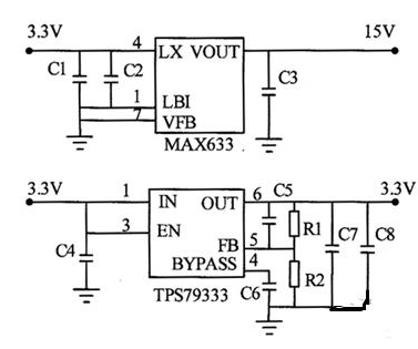 LQ035Q7D面板顯示需要15V的高壓,而LQ035Q7D的邏輯電平需要3.3V電源。圖3實(shí)現(xiàn)從3.3V轉(zhuǎn)換到15V和3.3V的電源原理。其中3.3V到3.3V使用TI公司的TPS79333,是為了保證輸出到LCD的3.3V穩(wěn)定可靠,如果TPS79333的輸入3.3V足夠穩(wěn)定,滿(mǎn)足LQ035Q7D的要求,也可以直接將該電源連接到LCD。