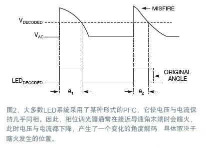 由于大多數(shù)LED系統(tǒng)都采用了某種形式的PFC,輸入電流通常能很好地追隨輸入電壓,這意味著當(dāng)電壓與電流同時下降時,相位調(diào)光器經(jīng)常會導(dǎo)通角的末端瞎火(圖2)。這種瞎火會根據(jù)其發(fā)生的時點,產(chǎn)生一種不斷變化的導(dǎo)通角解碼。