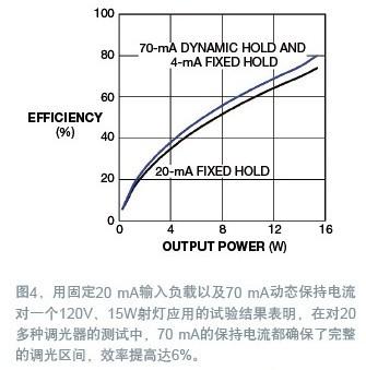 LM3450采用了這種采樣相位解碼器方法,因此只有在采樣周期內(nèi),動態(tài)保持才有效。為驗證這個方案,同時用一個固定的20 mA保持電流和一個大得多的70 mA動態(tài)保護(hù)電路,做了一個120V、15W的射燈應(yīng)用(圖4)。在對20多種調(diào)光器的測試中,70 mA動態(tài)保持法都確保了完整的調(diào)光區(qū)間,效率提高達(dá)6%。