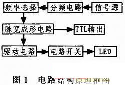 對水下成像系統(tǒng)而言,光源的選擇至關(guān)重要,光源的穩(wěn)定性、均勻性、響應(yīng)速度及其光波波長范圍是系統(tǒng)成像的關(guān)鍵。采用藍(lán)光LED所發(fā)出光光經(jīng)過水介質(zhì)——目標(biāo)反射——水介質(zhì)——接收光學(xué)系統(tǒng),最終在成像傳感器(CCD,ICCD)上成像。這就決定了LED必須工作在快脈沖驅(qū)動方式下,目前市場上的驅(qū)動電路一般均丁作在慢脈沖驅(qū)動模式(μs量級),遠(yuǎn)不能滿足我們的要求。因此,我們必須自己解決快脈沖驅(qū)動電路這一難題,尤其是實現(xiàn)以ns量級的大功率快脈沖來驅(qū)動大功率的LED。基于這種實驗實際需求,我們研究開發(fā)了此種快脈沖驅(qū)動電路。該電路的基本功能是產(chǎn)生低頻、快速、大功率驅(qū)動電流脈沖信號,輸出脈沖的頻率與周期精確度高,穩(wěn)定性好,脈沖信號寬度在20~100 ns內(nèi)分5檔可調(diào),輸出在50 Hz的基準(zhǔn)頻率下工作。脈沖信號通過驅(qū)動電路,輸出一個快脈沖信號驅(qū)動輸出電流開關(guān),產(chǎn)生一個大電流脈沖信號驅(qū)動一個大功率LED。為了達(dá)到設(shè)計要求和目的,我們采用晶振電路產(chǎn)生高精度頻率/周期基準(zhǔn)脈沖作為內(nèi)置信號源,通過對基準(zhǔn)脈沖進(jìn)行多次分頻,產(chǎn)生所需頻率的輸出脈沖信號,這樣可以獲得頻率穩(wěn)定的脈沖信號,同時實現(xiàn)了頻率選擇。經(jīng)過分頻后的脈沖信號再經(jīng)過脈沖寬度成形電路實現(xiàn)脈寬調(diào)節(jié),然后經(jīng)過電流開關(guān)電路,產(chǎn)生大電流脈沖,使LED發(fā)光。該驅(qū)動電路主要由以下幾個部分組成:信號源、分頻電路、頻率選擇、脈沖寬度電路、TTL輸出、驅(qū)動電路和電流開關(guān)電路。其框圖如圖1所示。