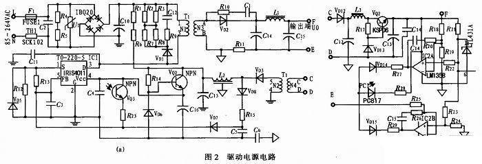 基于IRIS4011的電路由輸入保護(hù)電路,EMI抑制電路,輸入整流濾波電路,直流變換電路,輸出濾波電路,輔助供電電路,二次恒壓/恒流反饋電路組成。輸入電壓:85~264 VAC;輸入頻率47~63 Hz;輸出電壓5~24 VDC;輸出電流2.5 A;恒流精度±2.5%;最大輸出功率:60 W。利用變壓器的電感與瓷片電容實現(xiàn)準(zhǔn)諧振工作模式,電路簡單,可靠性高。準(zhǔn)諧振控制模式,能提高電路的轉(zhuǎn)換效率,降低EMI干擾。用放大器來實現(xiàn)恒壓、恒流控制,可以得到很高的控制精度。在輸出電流比較大的電路中,必須用放大器控制形式才能提高控制精度與提高電路轉(zhuǎn)換效率。限于篇幅,把電路圖分成2部分,具體的電路如圖2所示。