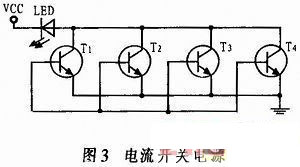 通過成形電路的信號,控制大功率藍(lán)光LED發(fā)光,驅(qū)動信號控制電流開關(guān)。電流開關(guān)選用一種大功率高頻三極管,為了滿足LED驅(qū)動電流的需求,將4只三極管并聯(lián),使流過LED的脈沖電流最大達(dá)到2.5 A,保證了LED在額定功率下工作,達(dá)到穩(wěn)定光源的目的。在輸入驅(qū)動信號的作用下,三極管進(jìn)入導(dǎo)通狀態(tài),LED兩端產(chǎn)生一定的壓降,大電流流過LED,使大功率藍(lán)光LED發(fā)光,作為距離選通水下成像系統(tǒng)的光源,電路如圖3所示。