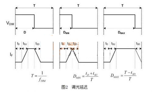 對于PWM調(diào)光訊號而言,每個LED都有限定的響應(yīng)時間,圖2表示三種不同的延遲,延遲愈大者表示能達到的對比度就愈低(對光強度控制的一種測量方法)。