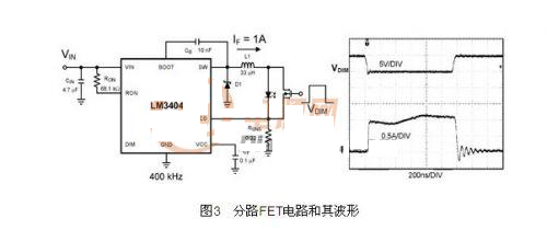 從一個沒有輸出電容器的快速降壓穩(wěn)壓器著手,出現(xiàn)在輸出電流開啟和關(guān)閉的延遲,是來自集成電路本身的傳導(dǎo)延遲和輸出電感器的物理特性。若要達到真正高速的PWM調(diào)光,兩個延遲都須被略過(By Pass)。要實現(xiàn)這個目標,最佳方法就是采用一個與LED并聯(lián)的電源開關(guān)(圖3)。當(dāng)LED關(guān)閉時,驅(qū)動電流便會分流通過開關(guān),作用就如同一個典型的N型金屬氧化半導(dǎo)體場效晶體管(N-MOSFET),這時集成電路會繼續(xù)運行,而電感器電流也會持續(xù)流動。該方法的最大缺點在于LED關(guān)閉時,即使期間的輸出電壓下降到與電流感測電壓相同,仍會浪費功率。
