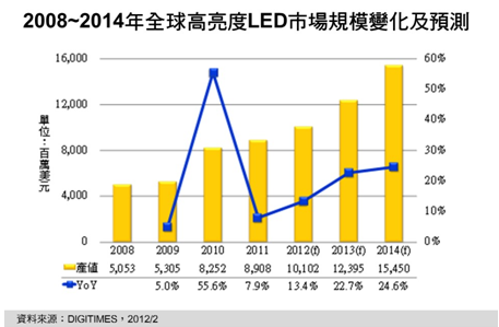 - 2012年全球高亮度LED產值年成長率將為13.4%